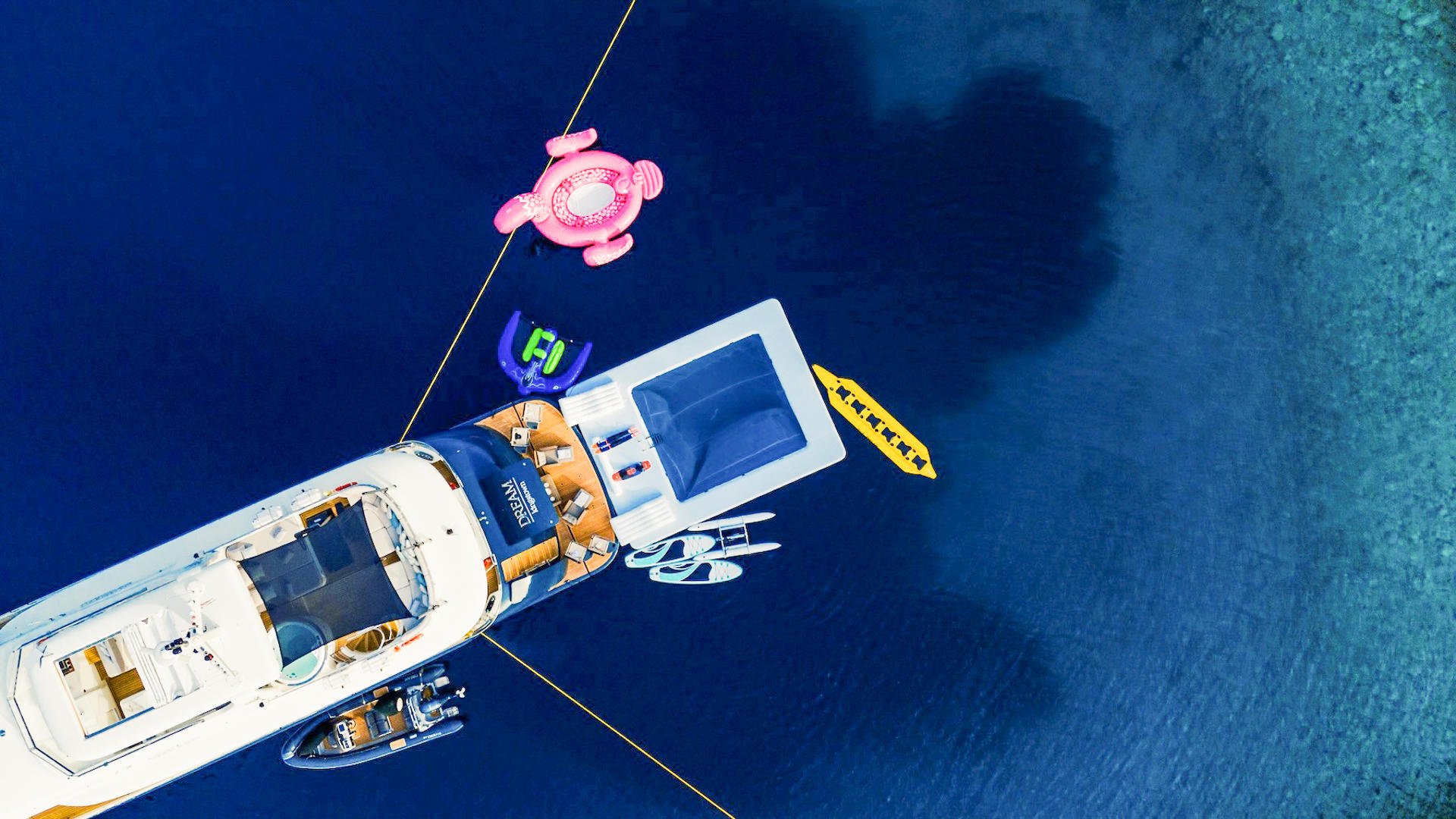 DREAM also introduces one of the most enjoyable additions for swimmers — an inflatable sea pool that turns the Adriatic into a private, net-protected swimming zone. Children can play safely in calm waters, while adults float in peace or use it as a launchpad for paddleboards and snorkelling sessions. Combined with the inflatable flamingo, the pool becomes a playful centerpiece that makes afternoons on the water even more memorable.