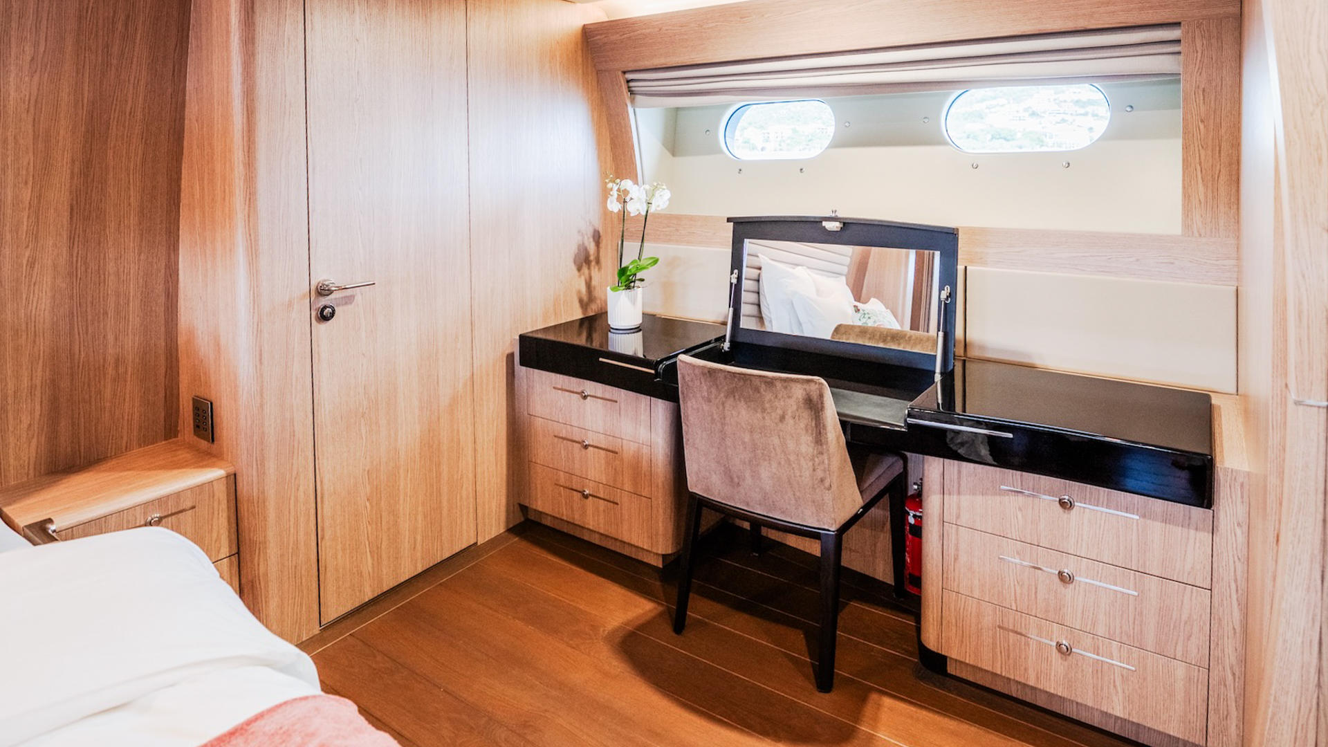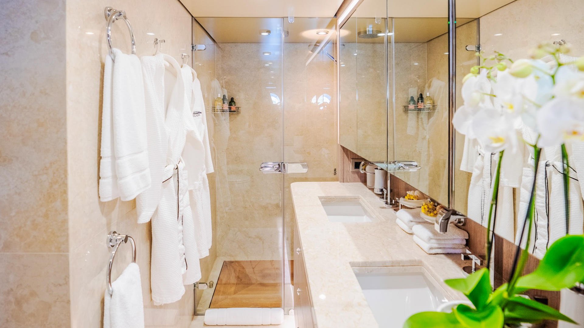 An en-suite bathroom extends the sense of indulgence, finished with polished surfaces and fitted with everything required for daily rituals of comfort. The master suite also offers a spacious wardrobe, allowing guests to unpack and feel entirely at home for the duration of the charter.