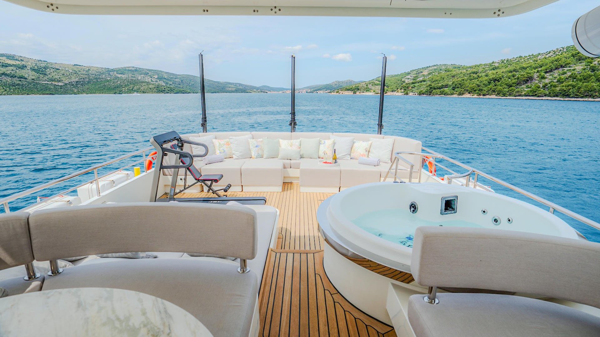 One of the most unique touches on DREAM’s flybridge is her dedicated fitness corner. Equipped with a treadmill and an adjustable training bench, this space proves that wellness is not sacrificed at sea. Exercising here feels extraordinary — running with the horizon ahead, or completing a strength session while the Adriatic stretches endlessly below.