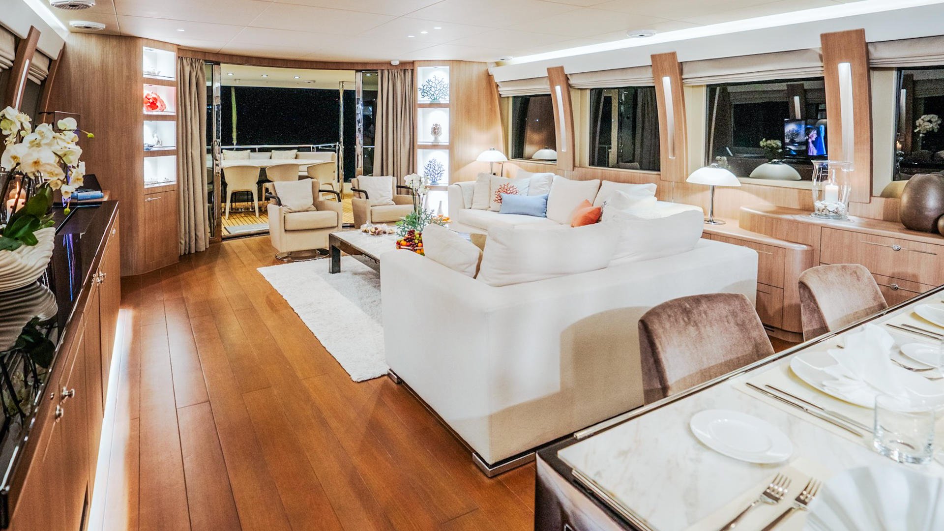 Aft, large glass doors open to the deck, where al fresco dining and lounging create a seamless continuation of the salon. Forward, the dining area takes center stage, with a polished table surrounded by elegant chairs. Nearly full-height windows on both sides offer panoramic vistas, turning every meal into a private theatre of the Adriatic. The layout allows both formal dining occasions and casual family meals, shaped to suit the mood of the charter.