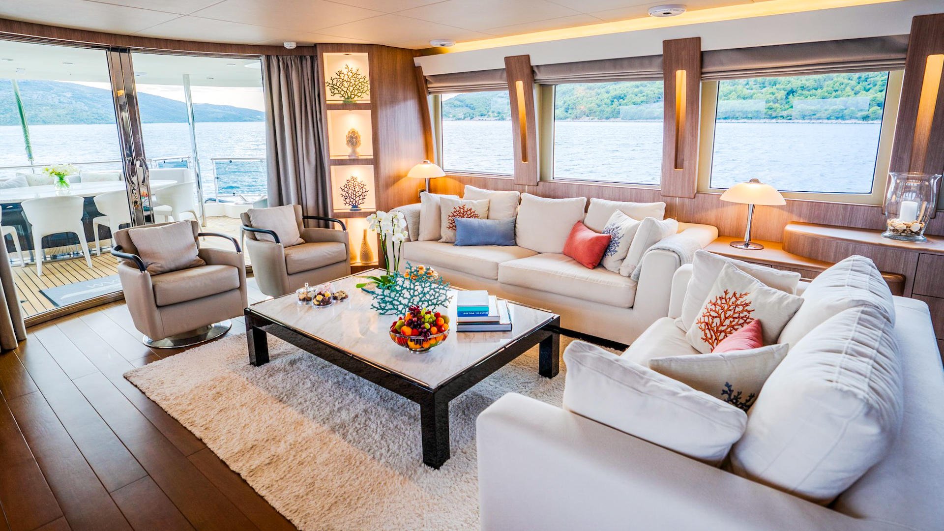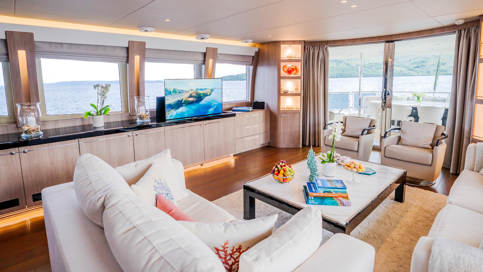 DREAM’s main deck has been designed to create a fluid harmony between indoor comfort and outdoor living, making it one of the most inviting spaces on this elegant motor yacht. The transition from the aft deck into the salon is effortless, with large sliding glass doors opening wide to frame uninterrupted views of the sea. This architectural flow removes barriers and draws the Adriatic coastline into the heart of the yacht, giving guests a more immersive connection to their surroundings.