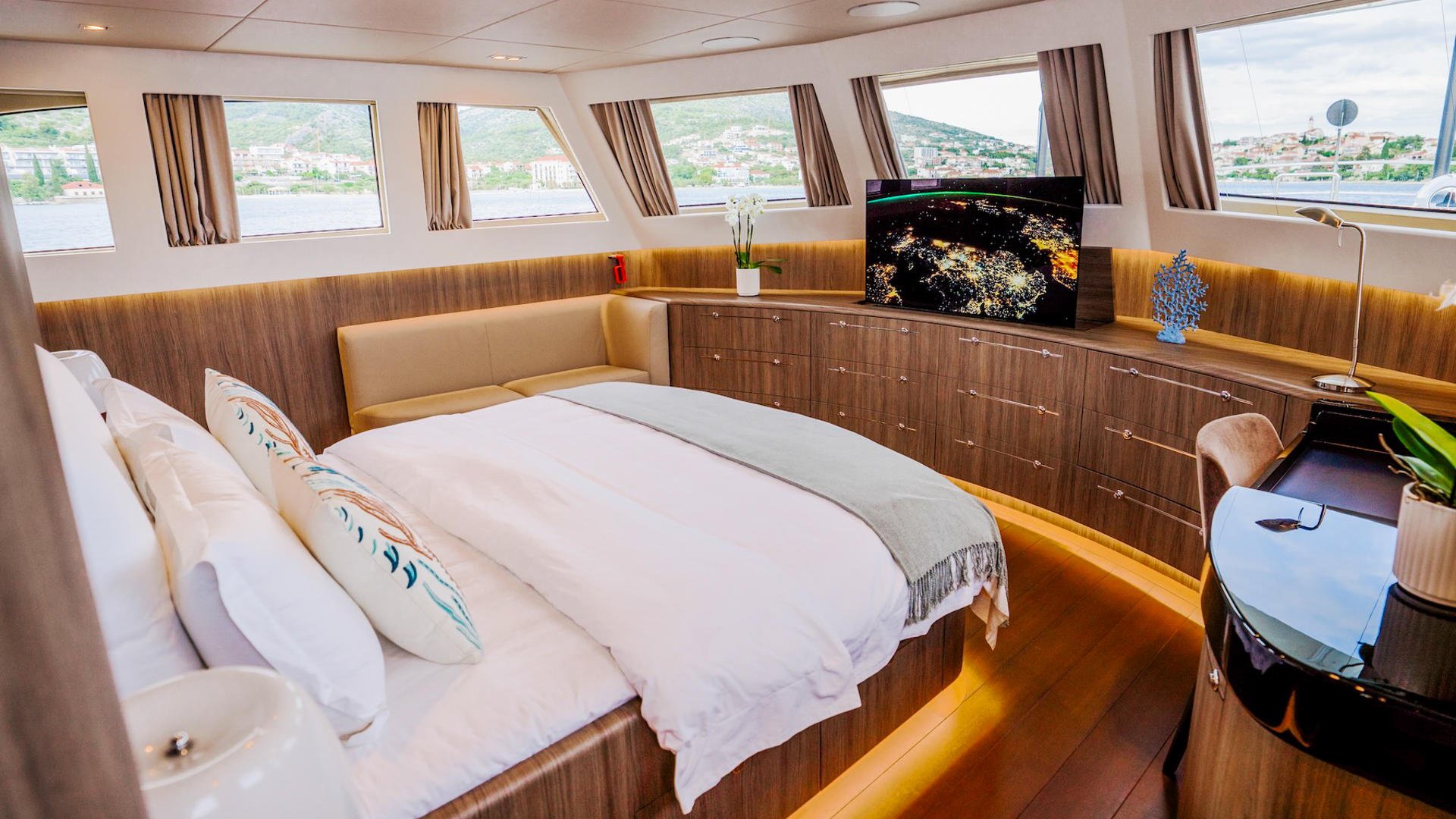 The centerpiece is a king-size berth, placed to face the ocean so mornings begin with the Adriatic as your first sight. Elegant wood finishes, soft textiles, and a calm color palette combined to form an atmosphere of understated luxury. Thoughtful details — from bedside lighting to carefully arranged storage — ensure the space is as practical as it is beautiful.